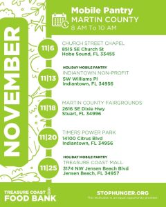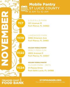 City of Fort Pierce and Treasure Coast Food Bank Presents: Annual Thanksgiving Food Giveaway. Takes place on Saturday, November 19 from 8am to 12pm (or until supplies last). Will be at Percy Peek Gymnasium (2902 Avenue D). Other county locations included in post.
