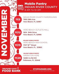 City of Fort Pierce and Treasure Coast Food Bank Presents: Annual Thanksgiving Food Giveaway. Takes place on Saturday, November 19 from 8am to 12pm (or until supplies last). Will be at Percy Peek Gymnasium (2902 Avenue D). Other county locations included in post.
