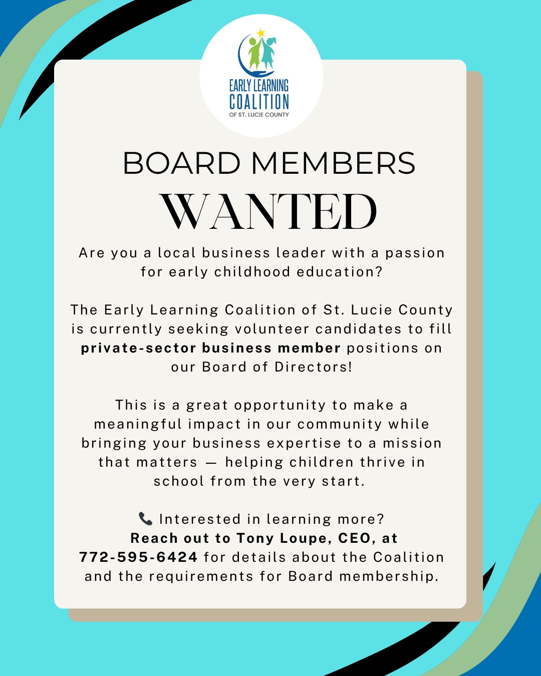 Coalitions were created to oversee and improve the readiness and successful outcomes of children from birth to kindergarten age in the community (F.S. 1002). The governor appoints the Chair and two additional private sector members. A maximum of 19 members may serve on the Coalition board.